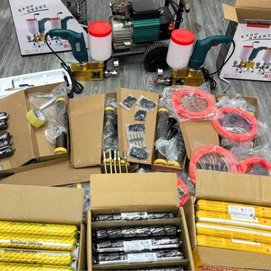 Bước 2: Chuẩn bị máy bơm keo chống thấm + kiểm tra máy + pha trộn dung dịch bơm