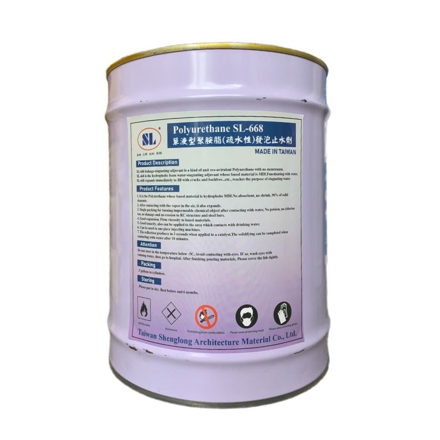 Keo PU trương nở SL 668 là dòng keo được sản xuất tại Đài Loan. Sản phẩm thuộc thương hiệu Shenglong. Đây là một trong những thương hiệu đi đầu về công nghệ chống thấm hiện nay trên toàn cầu. Keo PU trương nở SL 668 với thành phần chính là polyurethane 1 thành phần có độ trương nở cao từ 22 đến 34 lần khi được bơm vào các vết nứt rạn. thành phẩm sau khi trương nở đạt hiệu quả chống thấm và hàn gắn vết nứt cao. Keo PU SL 668 là dòng keo bơm chống thấm không thể thiếu trong quá trình xử lý và chống rò rỉ của vết nứt, rạn trên mọi công trình. Hỗ trợ tối ưu cho công tác chống thấm ngược.