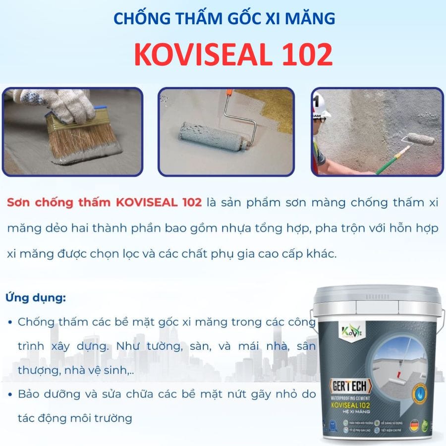- Chống thấm 2 thành phần Koviseal 102 cũng có thể được sử dụng để bảo dưỡng và sửa chữa các bề mặt đã bị hỏng do thời tiết hoặc sự mài mòn