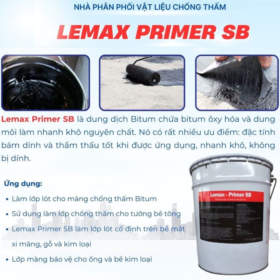 - Ngoài tính năng chính là tạo lớp liên kết trong công tác chống thấm màng khò. Primer Lemax SB còn được dùng để chống thấm mặt ngoài tường vây tầng hầm và mặt ngoài tường nhà dân dụng (Tường vách song). Nhằm thay thế cho các dòng sơn chống thấm gốc dầu kém chất lượng và tràn lan trên thị trường Việt Nam.